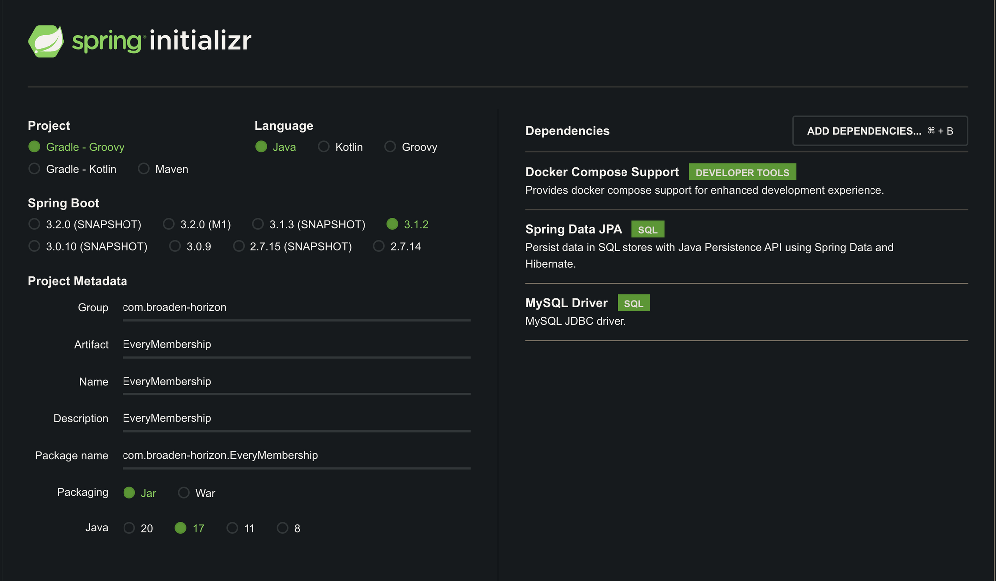 start.spring.io에서 Docker Compose support를 선택하고 사용하는 DB를 선택하면 자동으로 구동이 된다.
