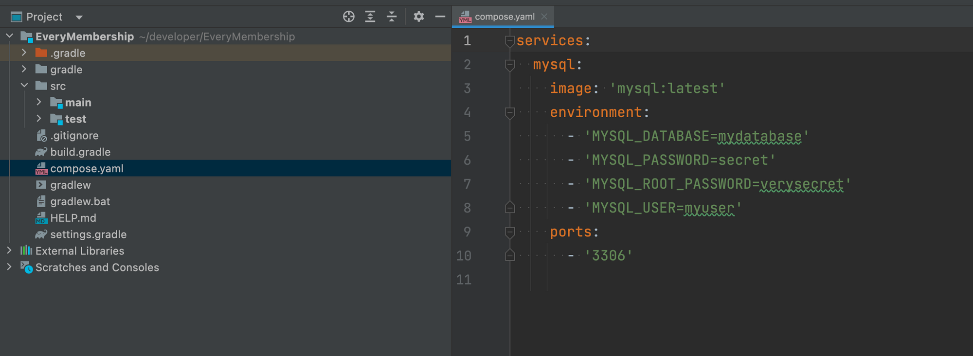 이후 살펴보면, 자동으로 compose.yaml 파일이 생성된 것을 볼 수 있고, 외부 포트 번호는 random으로 사용하고 있습니다.